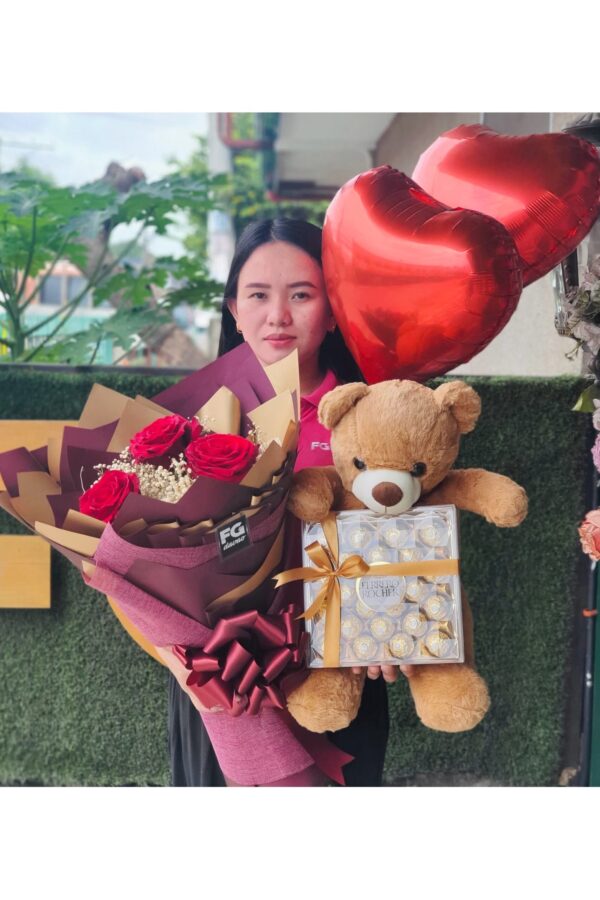 Bouquet of 3-stem Ecuadorian Roses, Bear Stuffed Toy, Heart Balloons, and Chocolates